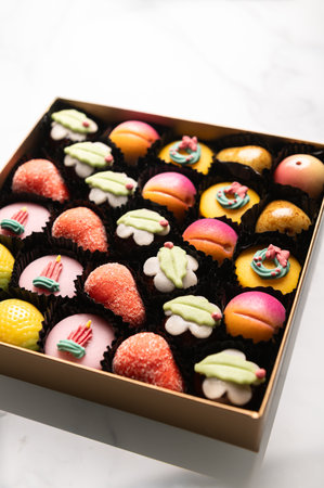 Box of rainbow marzipan sweets in form of different fruits and cakes