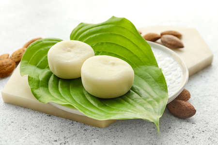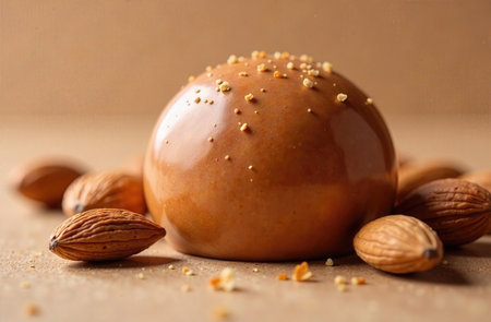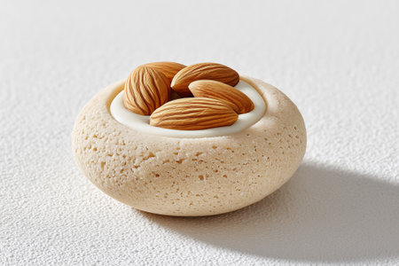 Creamy almond mousse placed on stylized edible stone. Textured white background enhances the sophisticated dish presentation. Concept of gourmet cuisine, dessert artistry, culinary trends.