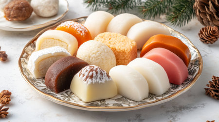 A beautiful assortment of traditional Japanese mochi desserts arranged on a decorative plate, showcasing vibrant colors and appealing textures for a festive presentation.