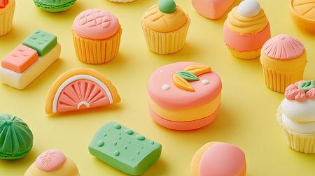 A table laden with summer desserts crafted from clay, celebrating a summer season filled with a rich, tactile texture that represents the feeling of enjoyment --chaos 30 --ar 16:9 --v 6.1 Job ID: 0e32662a-4ed6-43db-9267-dce55972b50a
