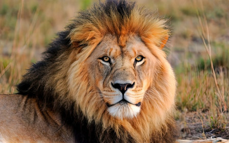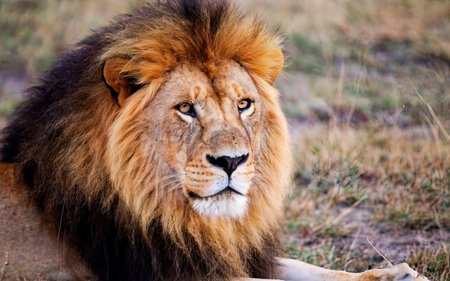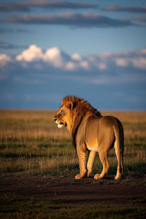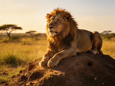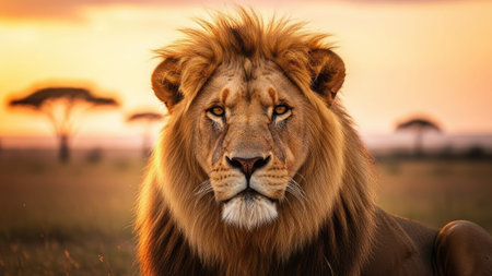 Majestic male lion in savannah at sunset, symbolizing the king of the wild in its natural habitat