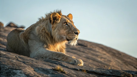 A powerful lion lies calmly on a rocky surface as the warm sunlight envelops the scene, highlighting its mane.