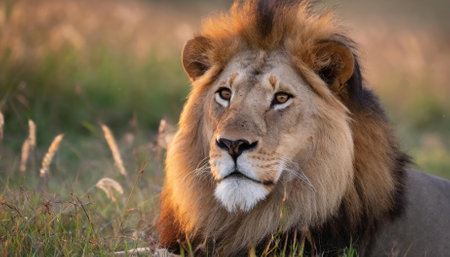 Close-up of a majestic male lion, its mane bathed in the warm glow of a setting sun. A lion with a long mane and a golden face stands in a field of tall grass