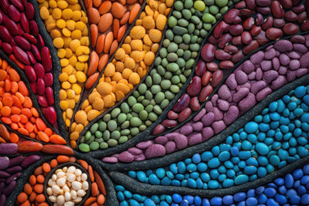 An elaborate pattern showcases vibrant beans, lentils, and seeds arranged in swirling colors, creating an eye-catching display.