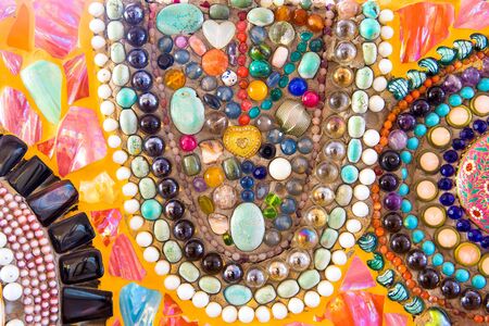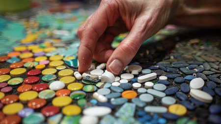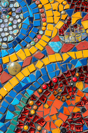 Close-up of an intricately designed mosaic. The image showcases a textured surface with colorful fragments forming unique shapes and patterns. It evokes a sense of artistry and detail.