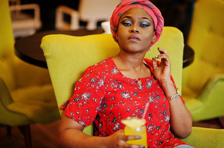 Stylish african woman in red shirt and hat posed indoor cafe and drinking pineapple lemonade.