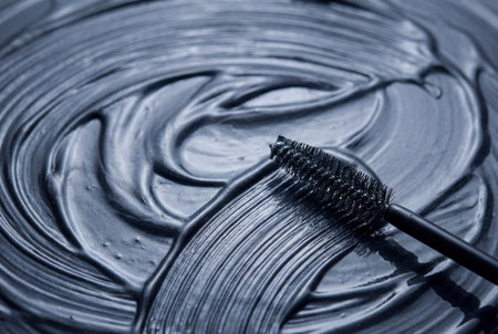 Dark grey mascara spread across surface with brush applicator nearby for natural eye enhancement in beauty routines, highlighting fluid texture and lustrous finish for makeup application visuals