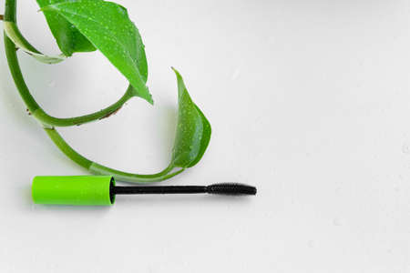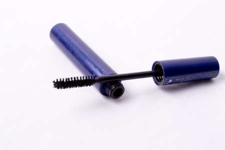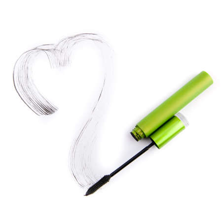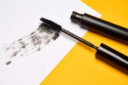 Mascara lies on a white background, and leaves a black mark showing how the brush works. Cosmetics and make-up personal care.