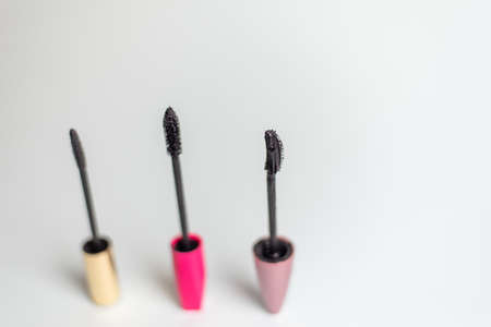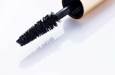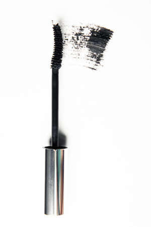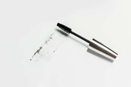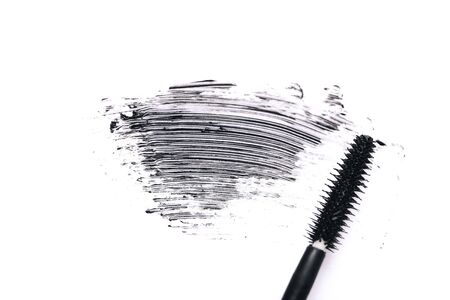 Black smear mascara and brush on white background. Trend concept. Isolated. Makeup. Cosmetic products for eyelashes. Photography. Top view. Beauty pattern. Beautiful template for design. Closeup