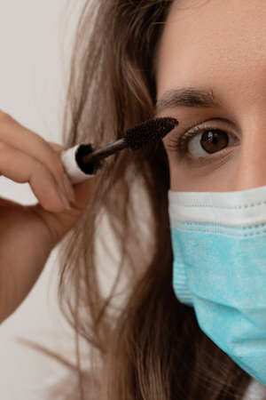 Woman in a medical mask does makeup, mascaras her eyes. The face of a young beautiful woman in a stylish mask