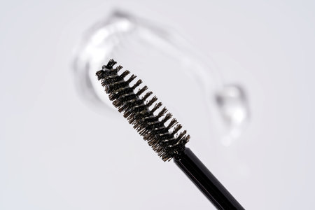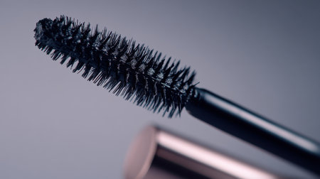 A detailed close-up image of a mascara wand coated in glossy black product, set against a soft background, perfect for beauty and cosmetics themes.