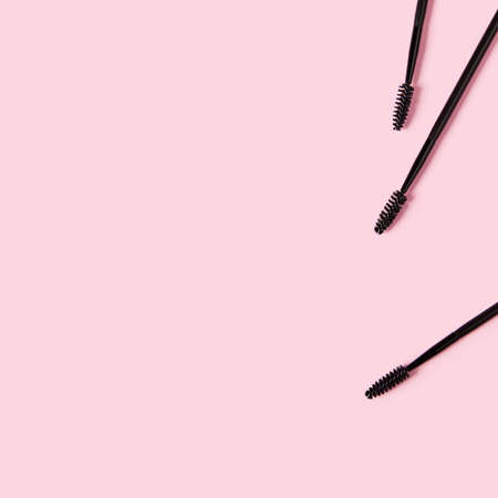 Black brushes and applicators for eyelashes and eyebrows on pink background. Womens cosmetics. Makeup for the face.