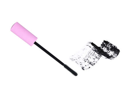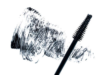 swatch, mascara brushstroke smear, mascara brush composition cosmetic isolated on white background flat lay