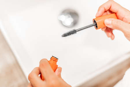 Women's hands hold the mascara open on a white background. A brush for applying mascara. The concept of cosmetics