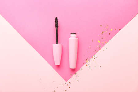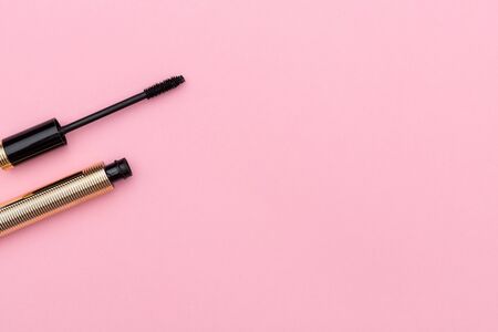 Basic products for eyelashes makeup. Mascara and false eyelashes on pink background top view copy space