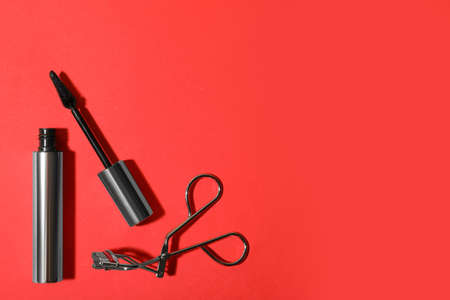 Black mascara and eyelash curler on red background, flat lay with space for text. Makeup product