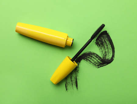 Mascara for eyelashes and smear on green background, flat lay. Makeup product