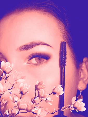 Woman holding mascara makeup brushes on the soft blue copyspace background