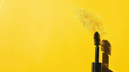 This captivating image features a mascara wand against a vibrant yellow background, enhanced by a glittering effect, perfect for beauty promotions.