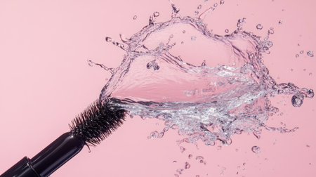 A dynamic image showcasing a makeup brush splashing water against a soft pink backdrop, emphasizing beauty and freshness in product photography.