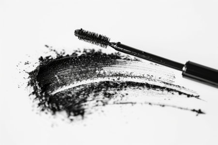 A sleek mascara wand lies beside a dramatic stroke of black mascara on a clean surface, showing the artistry of beauty application and the elegance of cosmetic products.