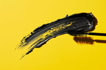 A mascara brush coated in rich black formula glides across a bright yellow backdrop, showing the perfect makeup tool for enhancing lashes and adding volume and depth to any look.