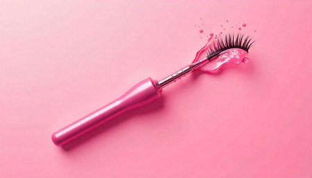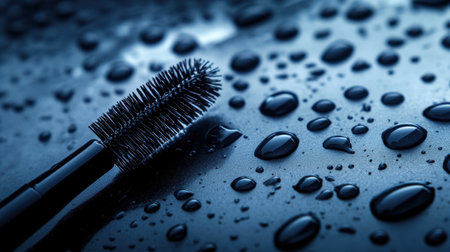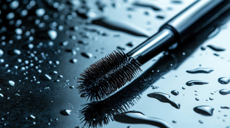 A close-up shot of a mascara wand on a sleek surface, enhanced by glistening water droplets. Perfect for beauty and makeup-related content, emphasizing elegance.