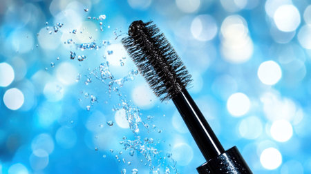 A striking close-up of a mascara wand sprays water drops against a vibrant blue background. This artistic image captures the essence of beauty and cosmetics.