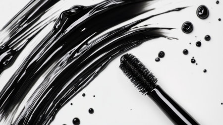 A close-up view of a glossy black mascara stroke beside a brush with droplets on a clean white background, perfect for beauty and cosmetic brand use.