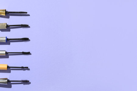 Various mascara brushes on a blue pastel background. The concept of choosing makeup products.