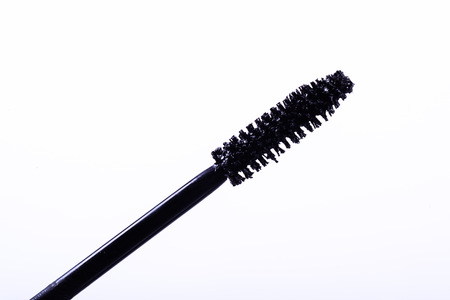 Stroke of black mascara with applicator brush close-up, isolated on white background