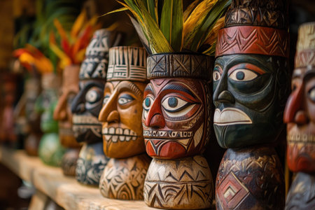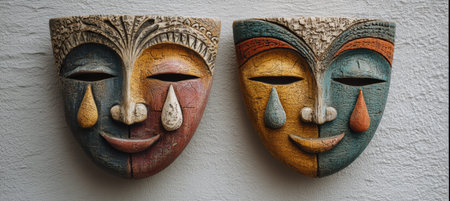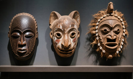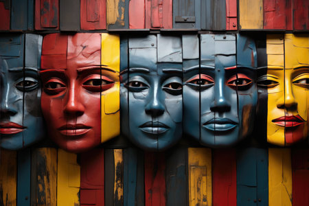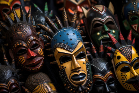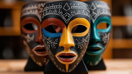 African masks displayed with vibrant colors and intricate designs. Close-up view highlighting cultural artistry and craftsmanship. Concept of art, cultural heritage, home decor.