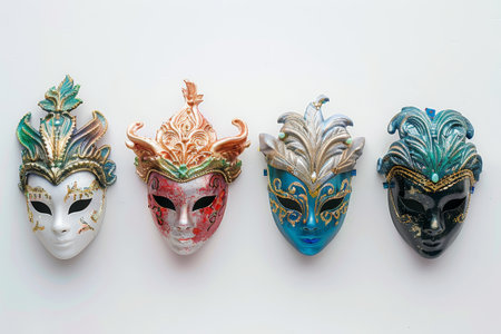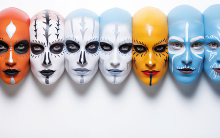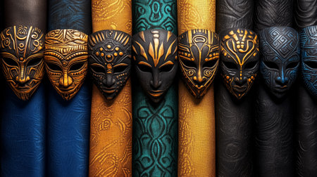 Colorful masks arranged in a row against textured fabric background. Intricate designs highlight craftsmanship and cultural themes. Concept of home decor, cultural exhibitions, art galleries.