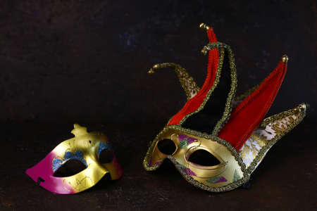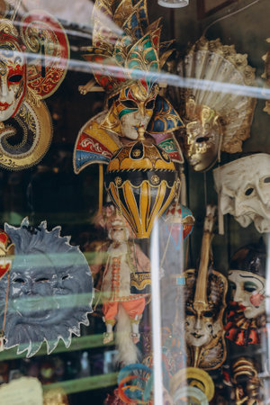 Venecia, Italy- Italy 2,2023:Venetian masks in store display in Venice.efront with a suit