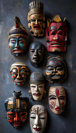 An assortment of uniquely designed masks is arranged closely together, showcasing a variety of facial expressions and cultural styles. The artwork utilizes vibrant colors and detailed textures. These striking images could be suitable for diverse editorial or commercial applications, including decorative elements or illustrative purposes.