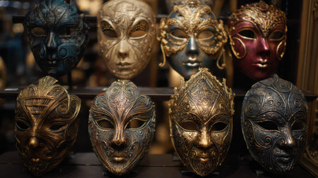 A display of colorful masques adorn the shelf, each one a unique and mysterious piece of clothing waiting to be worn