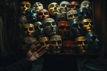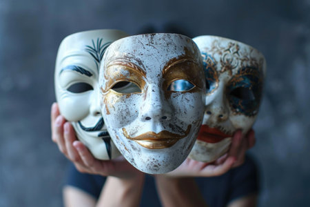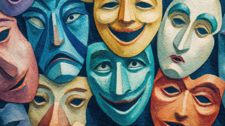 Fake emotion, character roles, intricate interplay of masks, moods, psychological defense mechanisms performed role-playing, concealing false visage for defense, theater Psychology psychoanalysis.