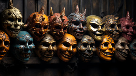 Colorful painted masks hanging. Decorative wooden multicolored handicrafts festival masks. Generate ai