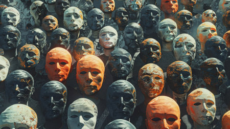 Numerous mannequins wearing disturbing masks create a chilling scene, evoking themes of hidden identities, conformity, and societal control
