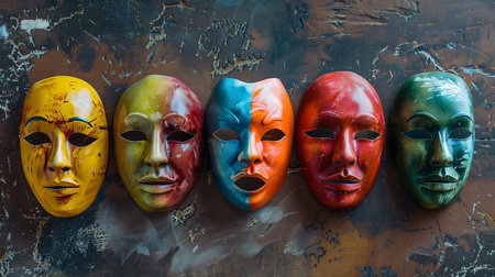 Creative concept showing a series of masks, each representing different emotions, hanging on a wall to symbolize the complexity of mental health