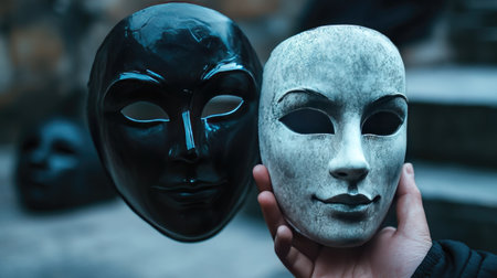 A hand holding a white theater mask in the foreground, with a black mask lying in the blurred background
