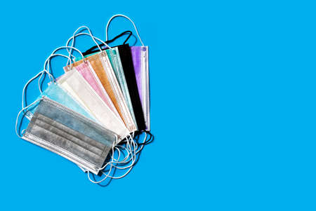 Medical masks on a colored background. Surgical blue mask. Medicine background