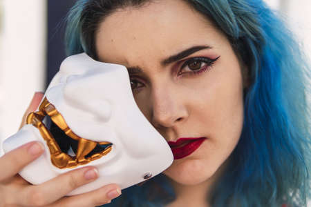 A closeup shot of a cool young lady with blue hair holding a mask in her hand