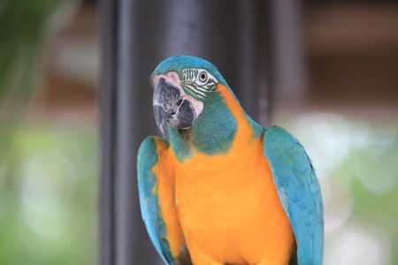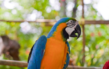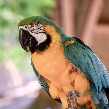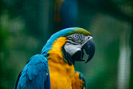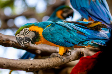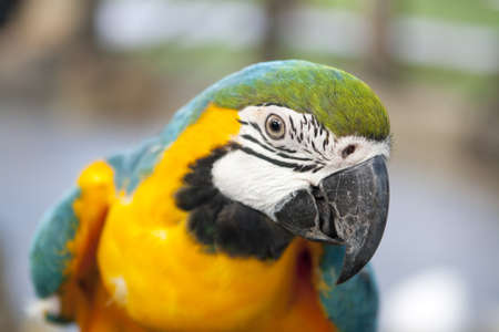 Detail of blue and yellow macaw, parrot at a bird sanctuary in Cartagena, Colombia