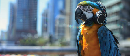 DJ parrot listening to music and dancing with headphones in the background of the street.