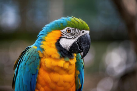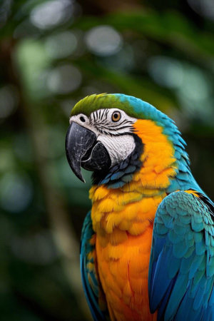 This stunning close-up portrait captures the vibrant colors and intricate details of a macaw parrot, showcasing its lively expression and gorgeous feathers.