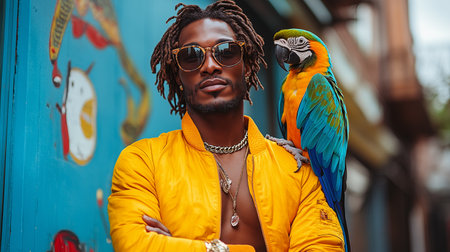 African american man with afro hairstyle wearing yellow jacket and sunglasses posing with parrot.