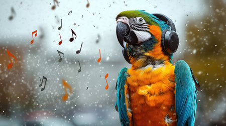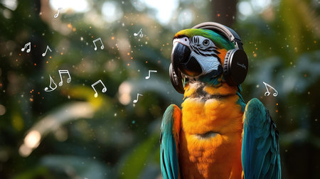 A parrot listens to music in headphones on the background of the jungle . There are musical notes flying around.