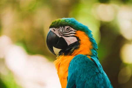 Tropical, exotic, talking, macaw, parrot, bird, wildlife animal, perched in nature with vibrant colors and eyes looking at you.