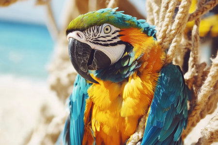 Vibrant Macaw Parrot Perched on Rope with Tropical Beach Background.